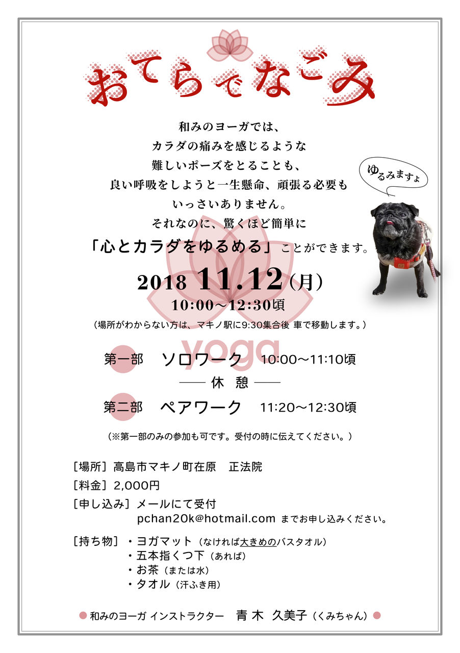の日」(11/4、い⇨1・い⇨1・よ⇨4)だそうです。「いいよ」と褒めたり、「いいよ」と許したり…。相手だけじゃなくて、自分自身にもできるといいですね。和みのヨーガで心身が緩むと、そういうことも少しずつできるようになってくるかも~