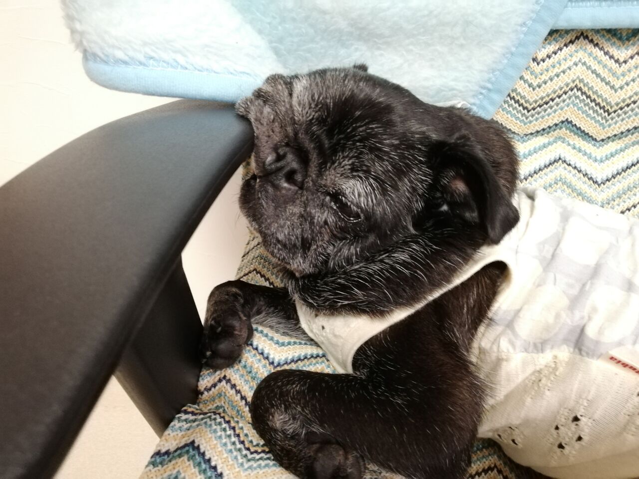 (↑ どうしても肘掛けに顎をのせたい豆。お顔がえらいことになってます